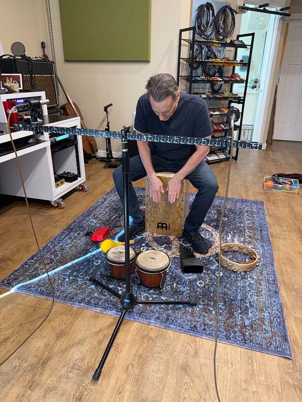 Ouimette verwendete Colette-Mikrofone mit MK 4-Kapseln als breites Stereopaar, um ein improvisierendes Percussion-Orchester aufzunehmen: Cajón, Bongos, Woodblocks, Shaker und einige seiner selbst gebauten Percussion-Instrumente. „Die Klarheit und Wärme der SCHOEPS Mikrofone waren genau das, was ich brauchte, um den richtigen Sound für diesen Track zu erzeugen", fasst er zusammen. „Ich arbeite seit über 20 Jahren im selben Raum und kenne ihn gut. Er ist kompakt und kontrolliert. Ich habe mein Percussion-Instrumentarium im Halbkreis aufgebaut und es mit den Colettes einfach so aufgenommen, wie es stand – so entstand ein schönes, tiefes Stereobild, das letztendlich wie ein riesiges Ensemble klang."